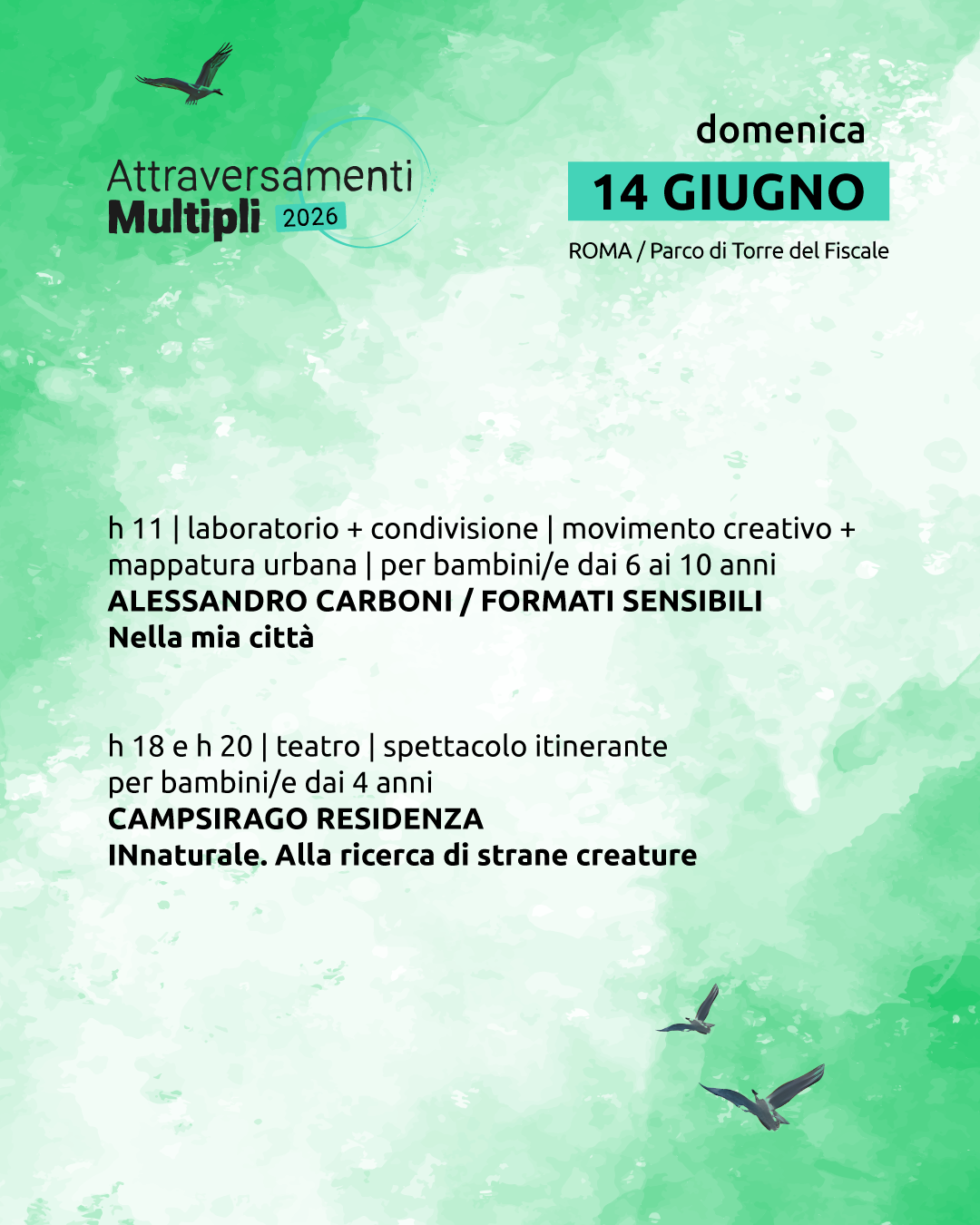 > il laboratorio di movimento creativo “Nella mia città” (14 giugno h 11) è rivolto a un numero limitato di bambini/e ( 6-10 anni). Il Biglietto – ridotto a 7 euro – è previsto per la partecipazione dei bambini, il momento di condivisone è gratuito e aperto ai genitori / accompagnatori.